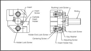 Balanced turning tools are used inthe turrets of screw machines,turret lathes, and CNC lathes andare the best tools for rough turning.Balanced turning tools will remove a greateramount of material than any other turning toolavailable because of the rugged construction and two carbide cutting tools. Tools are always on center line, and the two-axis adjustment compensates for any misalignment between turret and workpiece. Adjustment is easily made by a fine adjusting screw to align the insert and correct misalignment between turret and workpiece. The disposable carbide inserts are indexable with three cutting edges per insert and can be easily replaced in minutes by simply loosening the insert screw and inserting a new carbide insert. The new insert is automatically returned to the center line position and requires little or no adjustment to return to the proper turning diameter.Approximately 80 percent of the material can be removed with one cutter, and the remaining material with the other cutter for finish turning. For rough turning, the cutter many be set so each insert removes only one-half of the required cut. This is especially productive when removing large amounts of material.Standard carbide inserts have 1/64" radius on corners. Carbide inserts with 1/32" radius are also available. The inserts may be set in different manners, depending on the nature of the work and material, and on the preference of the operator.