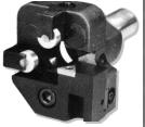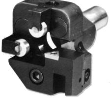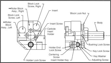 Carbide insert box tools are used in theturrets of screw machines, turret lathes,and CNC lathes for taking extra-heavy,rapid cuts in workpieces.Using triangular carbide throw-away inserts, downtime for tool bit sharpening is eliminated. You get a higher production rate at the lowest cost per cutting edge by removing stock 30% to 50% faster than with conventional cutters.The triangular carbide insert can be changed from one edge to another in less than a minute. Centerline is maintained when replacing the insert. Chips are controlled at any speed or feed rate or material by a built-in molded chip breaker.Extra-high roller blocks are available to provide support on the unfinished diameter of the workpiece.Carbide rollers and pins are available for extended wear.Standard carbide inserts have a 1/64" radius on corners; inserts with 1/32" radius are available and must be used with rollers that have a 1/64" chamfer.Old Style parts are listed on the Tooling Components page. All parts are available except the block.
