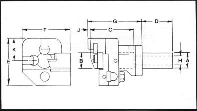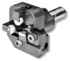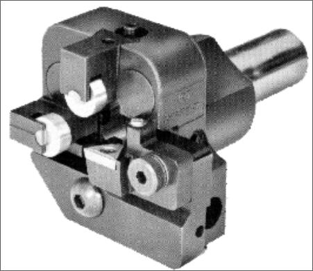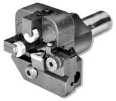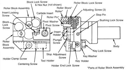 The carbide insert box tool is equippedwith a special self-releasing mechanismthat moves away from the stock at thesame time the turret pulls away fromthe workpiece. With this new machining innovation, you can eliminate scroll marks caused by cutter drag. Scrolling occurs when the cutter leaves the workpiece on standard carbide insert box tools. Not with the new TC-R box tool. Carbide insert box tools are used in the turrets of screw machines and turret lathes for taking extra heavy, rapid cuts in workpieces.By using triangular carbide throw-away inserts, you get higher production per cutting edge, and you remove 30% to 50% more stock than with conventional cutters. You can change from one edge to another in less than a minute Center line is maintained when replacing insert. Chips are controlled for any speed or feed rate or material by a patented chip breaker.Extra-high roller blocks are available to provide support on an unfinished diameter of a workpiece. Carbide rollers and pins are available for extended wear.Standard carbide inserts have 1/64" radius on corners; insert with 1/32" radius are available and must be used with rollers that have a 1/64" chamfer.