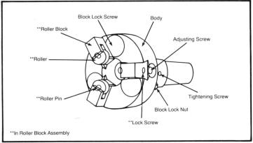 An ideal tool for use where a surfacesmoother than the usual machinedfinish is required. It is a ruggedburnishing tool, easy to eliminate anextra operation.Hardened adjustable rollers* exert pressure on the work surface to smooth out fine lines left by the turning tool.Diameter reductions are minimal and depend upon material, work diameter, and surface condition. Stainless steel .0004 to .0006 Cold drawn steel .0006 to .0008 Bronze .0007 to .0009This tool can also be used for knurling by replacing the burnishing rollers and with knurling block assemblies.*Rollers taper to a smaller diameter toward the shank end.